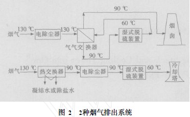 常規(guī)的煙氣排放系統(tǒng)和“煙塔合一”的煙氣排放系統(tǒng)如圖2所示。從圖中可見,采用“煙塔合一”技術可以省去煙囪和氣氣交換器( GGH) ,但增加1臺熱交換器。對于一個2 ×600 MW 電廠來說, 1座雙內(nèi)筒鋼筋混凝土煙囪加上地基處理,其投資一般在2 000萬元以上。