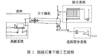 由熱源系統(tǒng)產(chǎn)生的熱風(fēng)進入到回轉(zhuǎn)圓筒中,與來自進料機的脫硫石膏進行傳熱傳質(zhì),將脫硫石膏的游離水分脫除;含有粉塵的潮濕氣體由回轉(zhuǎn)圓筒排入除塵系統(tǒng),達到排放標(biāo)準(zhǔn)后排空;干燥的石膏進入后序造粒、篩分系統(tǒng)。
