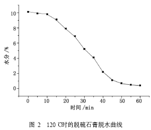 取表面水分為10%的脫硫石膏,在120 ℃烘箱內(nèi)烘干1 h,期間每隔5min取出一個樣品,測定其水分,得出脫硫石膏脫水曲線如圖2所示。