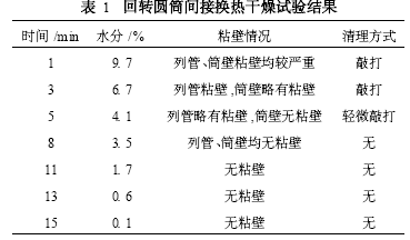 試驗中發(fā)現(xiàn),當(dāng)石膏水分高于6%時,需較強的敲擊力方可將粘結(jié)在壁上面的物料震落;當(dāng)水分在4%左右時,輕微敲打即可將粘結(jié)的物料震落;當(dāng)水分低于1. 7%時,則無粘壁現(xiàn)象(表1) 。