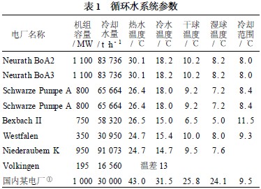 為保證冷卻塔的抬升效果,冷卻塔出口混合氣體垂直上升速度必須達(dá)到最低值3 m/ s (德國(guó)的范圍為(3~6) m/s) ,這樣,就要求進(jìn)入冷卻塔的循環(huán)水達(dá)到一定水量和溫度。表1 是幾個(gè)已實(shí)施(或準(zhǔn)備實(shí)施)煙塔合一工程電廠的循環(huán)水參數(shù)。