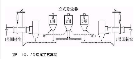 4)改造1號、2號、3號除塵器煙氣分流管道、風量調(diào)節(jié)閘板閥,3號窯的一部分廢氣分流到2號除塵器進行處理。這樣,相當于擴大了3號窯立式電除塵器收塵面積(原40m2增加為60m2),見圖5。
