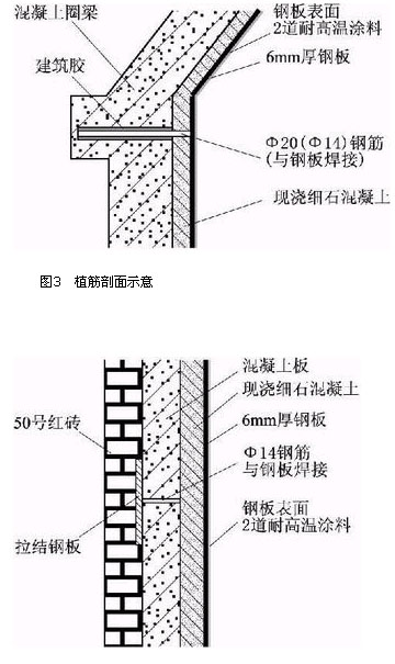 1)+21.595m混凝土結(jié)構(gòu)采取內(nèi)部表面處理,內(nèi)植筋加固,內(nèi)層鋼板焊接,鋼板與混凝土墻體之間采用拉鉚焊接,中間澆注細石混凝土,鋼板表面進行耐溫耐腐蝕涂料處理。植筋、拉結(jié)筋剖面見圖3、圖4。