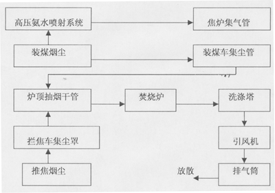 ![]() 圖1裝煤推焦煙塵二合一焚燒凈化的工藝方案 |