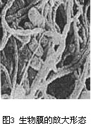 循環(huán)冷卻水適宜的溫度,大量不清潔的空氣,以及被太陽直射開放的集水池等諸多條件,均有利于各種微生物的生存與繁殖,圖3是生物膜的放大形態(tài)。