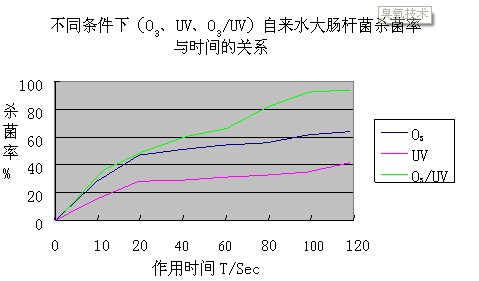 在自來水各項(xiàng)基本指標(biāo)都相同的條件下,用O3、UV、O3/UV分別做大腸桿菌殺菌率對(duì)比試驗(yàn),結(jié)果如圖一所示