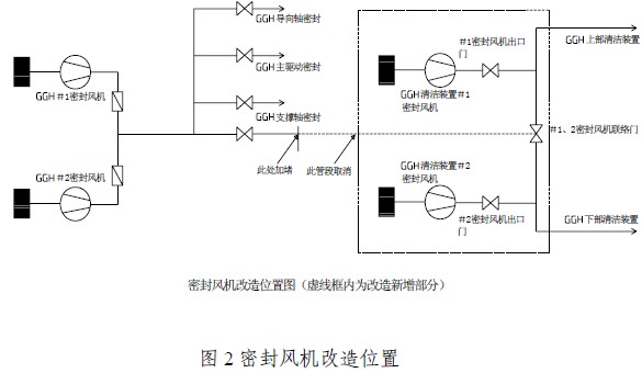一單元脫硫GGH兩臺密封風機為GGH支撐軸、導向軸、GGH主驅(qū)動和兩臺GGH清洗裝置提供密封風,但投產(chǎn)后兩臺密封風機不能滿足設(shè)備要求,致使清洗裝置漏風嚴重,對設(shè)備產(chǎn)生腐蝕,經(jīng)增容仍不能達到要求,后與廠家協(xié)商,為保證清洗裝置有良好的密封效果,將原通向清洗裝置的密封風管加死堵,為兩臺GGH清洗裝置各安裝一臺密封風機,提供密封風,風機型號為SE0300C、額定功率2.2kW、最大靜壓190mbar、最大風量320立方米每小時。加裝位置見圖2: