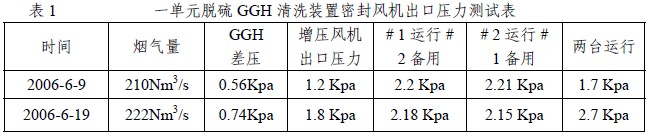 按廠家原設(shè)計,每臺密封風機只為一部GGH清洗裝置提供密封風,但通過對以往增壓風機運行數(shù)據(jù)分析,得出一臺風機就可滿足兩部GGH清洗裝置的需要,所以我們提出在兩臺密封風機出口管之間加裝聯(lián)絡(luò)門,采取一運一備的運行方式,這樣既可以保證設(shè)備安全運行又方便檢修。這一建議在機組投運后所作測試(見表1)中得到論證。通過對三個月來的運行情況檢測,效果非常理想。