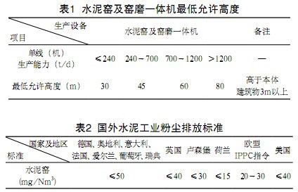 國家環(huán)境保護總局2004年12月29日頒布了《水泥工業(yè)大氣污染物排放標(biāo)準(zhǔn)》(GB4915-2004),統(tǒng)一了回轉(zhuǎn)窯和立窯的排放標(biāo)準(zhǔn),不再按功能區(qū)規(guī)定排放標(biāo)準(zhǔn),對現(xiàn)有生產(chǎn)線實行了統(tǒng)一的標(biāo)準(zhǔn)并設(shè)置了達標(biāo)過渡期,提高了新建生產(chǎn)線水泥工業(yè)大氣污染物的排放標(biāo)準(zhǔn)。 2006年7月1日起至2009年12月31日止,現(xiàn)有生產(chǎn)線水泥窯及窯磨一體機排氣筒中的顆粒物排放濃度不得超過 100mg/Nm3 ;自2010年1月1日起,現(xiàn)有水泥窯及窯磨一體機排氣筒中的顆粒物排放濃度不得超過50mg/Nm3 , 單位產(chǎn)品排放量不得超過0.15kg/t,也就是說,隨著經(jīng)濟的發(fā)展,國家對污染物的排放標(biāo)準(zhǔn)越來越嚴(yán)格。水泥窯及窯磨一體機最低允許高度見表1,國外水泥工業(yè)粉塵排放標(biāo)準(zhǔn)見表2。