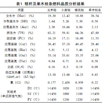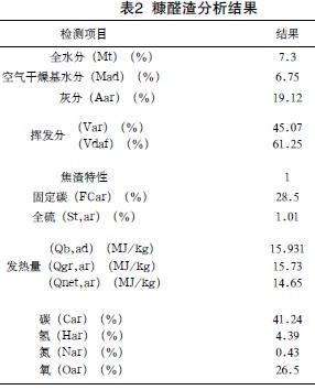秸稈及果木枝條正常水分(Mar)≤25%,但每年有2~3個(gè)月,秸稈水分可能高達(dá)40%~50%。秸稈及果木枝條燃料品質(zhì)分析結(jié)果見(jiàn)表1;糠醛渣分析結(jié)果見(jiàn)表2。