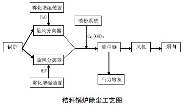 (1)煙氣需先進(jìn)入旋風(fēng)除塵器,除去未充分燃燒的秸稈灰,以保護(hù)濾袋;旋風(fēng)除塵器上需布置霧化增濕裝置,以滅明火降煙溫。