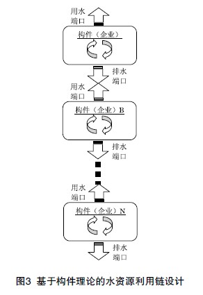 在基于生態(tài)工業(yè)學(xué)設(shè)計(jì)的水資源利用鏈基礎(chǔ)上,在各個(gè)水資源利用要素的耦合上面,借用現(xiàn)代計(jì)算機(jī)構(gòu)件理論,將各企業(yè)看成一個(gè)構(gòu)件。關(guān)于企業(yè)內(nèi)部如何運(yùn)作(在園區(qū)角度)本文不作討論,本文只對(duì)企業(yè)這個(gè)構(gòu)件的水資源的輸入和輸出端進(jìn)行分析研究。在這兩個(gè)端口,本文重點(diǎn)關(guān)心其用水的水量(X)和水質(zhì)(Y),這樣可以將其看成一個(gè)二元函數(shù)F(X,Y),在每個(gè)構(gòu)件鏈接時(shí)只要排出端口和輸入端口的函數(shù)吻合,便可以實(shí)現(xiàn)有效鏈接。在構(gòu)件設(shè)計(jì)的時(shí)候,必須考慮該構(gòu)件是否具備可供運(yùn)行時(shí)訪問(wèn)的接口;并且,在開發(fā)生命周期的某個(gè)時(shí)間點(diǎn),該構(gòu)件可否獨(dú)立交付和安裝。另外,還要求一個(gè)構(gòu)件能方便地跟其他構(gòu)件合并或組合,從而提供有用的功能—通常情況下,單個(gè)構(gòu)件只有跟別的構(gòu)件協(xié)同工作才能達(dá)到其功效。