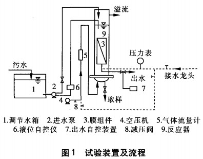 采用兩套完全相同的裝置(分別記作ln}2#)進(jìn)行試驗(yàn)。工藝流程見(jiàn)圖1反應(yīng)器為有機(jī)玻璃制成,直徑為200mm,高為2m,內(nèi)置孔徑為0.2um、膜面積為0.5m2的聚偏氟乙烯中空纖維膜組件。依重力間歇出水,由液位自控儀控制反應(yīng)器內(nèi)水位基本恒定。