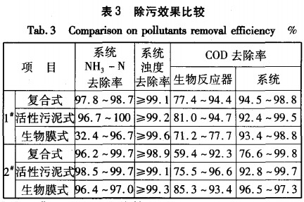 從表3可知,三種一體式膜生物反應(yīng)器對(duì)氨氮、濁度和COD的去除率都很高,但生物反應(yīng)器去除COD的效果相差較大,相比較而言活性污泥一膜生物反應(yīng)器的去除效果更穩(wěn)定些。