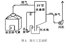 含塵煙氣經(jīng)過SV型洗滌器凈化后由 4—72№3·2A風(fēng)機(jī)引出排入大氣。凈化含鉛廢氣所需用水由25WG型污水泵提供,凈化器排出的廢水流入水封槽后進(jìn)入污水池。除塵工藝流程見圖1。