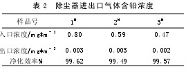 在除塵器進(jìn)出口分別設(shè)采樣點(diǎn),測(cè)出在系統(tǒng)正常運(yùn)行時(shí),除塵器進(jìn)、出口氣體含鉛濃度,見表2。