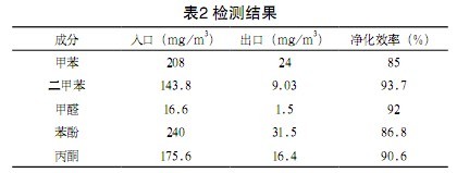 在裝置正常運(yùn)行約20分鐘后,在進(jìn)出口同時采樣,采樣位置為圖1中A、B處,每次采樣時間為15分鐘,共3次。苯及苯化物的測量采用氣相色譜儀,檢測結(jié)果見表2。