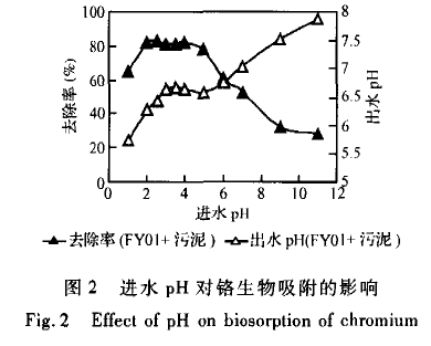 從上述反應(yīng)式中可以看出,鉻的還原需要消耗電子和以[H ]為代表的還原力。如(1)、(2)式,在電解法處理重金屬鉻中,電子的提供由直流電產(chǎn)生。而利用生物吸附法處理含鉻廢水時,在酸性廢水中,微生物會優(yōu)先利用水體的[H ],從而使處理后出水的pH上升并趨近中性;在堿性廢水中,這些電子及還原物質(zhì)的產(chǎn)生主要來自微生物體內(nèi)大分子葡萄糖、脂類和蛋白質(zhì)等的分解,產(chǎn)生的部分[H ]分泌到水體中,從而降低水體的pH。不同種屬的微生物在適宜的pH下進行鉻的還原與吸附時,改變了水樣的pH,使之適合于其他微生物對鉻的吸附。同時,活性污泥具有緩沖pH的作用,使水樣的pH適合于復合生物吸附劑的生長和對重金屬的生物吸附。以下實驗不對電鍍廢水進行預處理,均在原水pH下進行。因為該pH值與大部分金屬表面加工行業(yè)的含重金屬廢水的pH值接近;同時,該值處于適宜pH平臺值的中部,易于調(diào)控,研究結(jié)果在實際應(yīng)用中具有較好的參考價值。