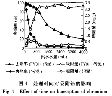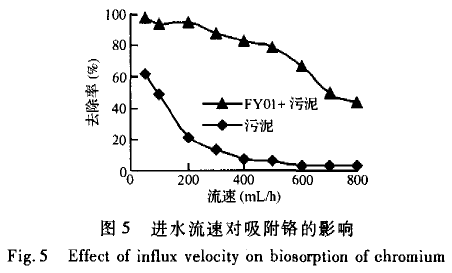 圖5是2種吸附材料處理不同進水流速的電鍍廢水2 h后的實驗結(jié)果。處理的水量隨進水流速的增加而增大,當流速達500 mL/h,處理水量達1000 mL后,10 g FY01和5 g污泥的除鉻效率下降速度增快。而在低進水流速時,15 g污泥的除鉻效率降低速度較快。這與}引尼對鉻的吸附容量小、還原解毒能力不足等因素有關(guān) 。
