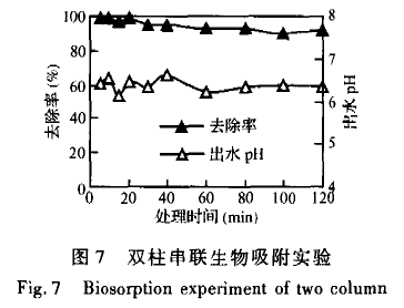 利用裝有10 g FYO1和5 g污泥的吸附柱串聯(lián)處理1000 mL/h電鍍廢水2 h的結(jié)果如圖7。串聯(lián)生物曝氣工藝對含鉻廢水的處理效果理想,對鉻的去除均達90%以上,比單柱的效率高10% ;出水pH在6.15 —6.61之間。在該處理過程中,第2吸附柱進水是第1柱的出水,總鉻濃度已降至原水的60%左右,六價鉻已被有效地還原為低毒性的三價鉻 。有利于第2吸附柱中的生物吸附材料對鉻的體內(nèi)積累,促進鉻的生物去除。串聯(lián)法也減少了廢水短流對處理效果產(chǎn)生的影響。