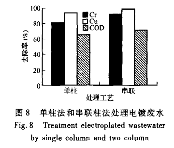 本實驗分別采用了單柱吸附法和串聯(lián)柱吸附法處理電鍍廢水,每根柱裝10 g FY01和5 g活性污泥,單柱處理廢水1000 mL,雙柱處理2000 mL,處理時間均為2 h。圖8結(jié)果表明,串聯(lián)法處理該電鍍廢水是非常有效的,對廢水中60.4 Illg/L總Cr、4.51 mg/L Cu“和48.2 mg/L COD的去除率分別高達92.1% 、99.2% 和71.4% 。