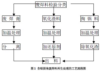 圖1 是含鉛固體廢焊料再生處理的工藝流程圖。按圖所示,首先要對(duì)廢焊料進(jìn)行檢驗(yàn)分類,并對(duì)廢焊膏、廢氧化渣和掏鍋料分別采用不同的工藝進(jìn)行回收處理。