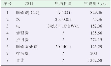 NID脫硫單套裝置年耗脫硫劑(CaO)19400 t,年脫除SO2量約為22171t。年總運(yùn)行成本為1362.58萬元,脫除1tSO2成本為614.6元。