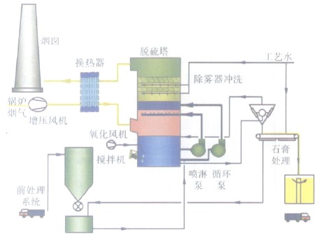 140℃鍋爐煙氣通過增壓風(fēng)機(jī)進(jìn)入換熱器換熱降溫至110℃,隨后從脫硫塔下方進(jìn)入,在塔內(nèi)煙氣與脫硫劑進(jìn)行傳質(zhì)、傳熱,發(fā)生脫硫反應(yīng)。脫硫后的煙氣溫度降為55℃,經(jīng)過除水,從脫硫塔頂排出,再進(jìn)入換熱器換熱升溫至75℃左右,進(jìn)入煙囪高空排放。