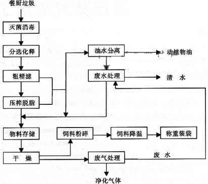在135℃、0.4MPa的條件下,有效滅活餐廚垃圾所攜帶的各種病菌、病毒及寄生蟲卵等;再經(jīng)固液分離,固體部分進(jìn)行壓榨脫脂,使纖維類物質(zhì)達(dá)到初步脫水,得到的大塊固體物質(zhì)可直接干燥粉碎,作為優(yōu)質(zhì)的飼用原料;液體部分經(jīng)油水分離器分離成油脂和水,油脂經(jīng)調(diào)節(jié)酸度、沉淀等工藝處理后作工業(yè)原料,廢水經(jīng)靜濾處理后部分固體物質(zhì)進(jìn)入壓榨設(shè)備。