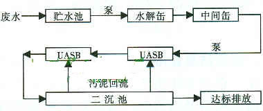生產(chǎn)中產(chǎn)生的廢水充入貯水池,然后泵入水解池酸化水解2~3h,流入中間擊暫存并調(diào)節(jié)酸度,然后泵入兩級串連上流污泥床式生物反應(yīng)器UASB,經(jīng)生物充分降解后自流入二沉池沉淀,同時活性污泥回流,清水達(dá)標(biāo)后排放。