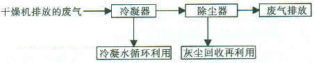經(jīng)干燥機(jī)排氣管所排放的廢氣由引風(fēng)機(jī)引出,經(jīng)冷凝,冷凝水回收循環(huán)利用,廢氣經(jīng)引風(fēng)機(jī)排放,除塵器的灰塵回收可返回午燥機(jī)再利用。
