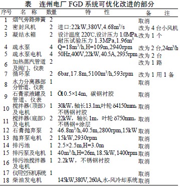 表中給出了目前連州電廠FGD 系統(tǒng)設(shè)備可優(yōu)化改進(jìn)的部分。改進(jìn)后系統(tǒng)將到極大簡(jiǎn)化,自然可以節(jié)約大量投資。