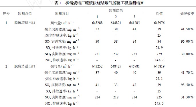 柳鋼燒結(jié)廠83 m2 燒結(jié)機(jī)采用了硫銨法脫硫工藝,于2007 年3 月投入試生產(chǎn)。根據(jù)環(huán)境監(jiān)測(cè)站2007 年11 月對(duì)該脫硫設(shè)施的監(jiān)測(cè)結(jié)果 (見(jiàn)表1) ,其脫硫效率在95 %以上,除塵效率為 40 % ,運(yùn)行情況較穩(wěn)定。