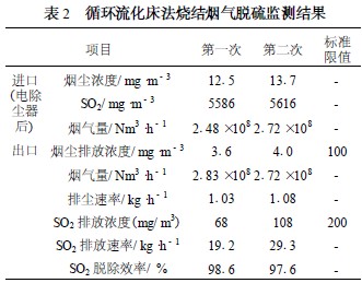 福建三鋼廠180 m2 燒結(jié)機(jī)采用循環(huán)流化床法煙氣脫硫工藝,于2007 年10 月投入試運(yùn)行。根據(jù)環(huán)境監(jiān)測(cè)站對(duì)其進(jìn)行的監(jiān)測(cè)結(jié)果(表2) 表明,其脫硫效率在98 %以上,脫硫效果好,運(yùn)行情況較穩(wěn)定。