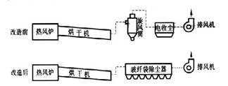 我們曾調(diào)查了二十幾家水泥廠的烘干機(jī)收塵器使用情況,對多種除塵器的性能進(jìn)行了分析比較,最后選用LFEF抗結(jié)露玻纖袋除塵器,將原兩級除塵改為一級除塵,出烘干機(jī)氣體直接進(jìn)入袋除塵器,處理后的廢氣經(jīng)排風(fēng)機(jī)排入大氣。改造前后的除塵系統(tǒng)流程見圖1所示。