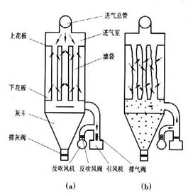 該種型式的玻纖袋除塵器如圖2所示:其排氣閥、反吹風(fēng)閥均設(shè)于下面排氣管處。正常工作時如圖2(a),含塵氣體在排風(fēng)機(jī)作用下吸入進(jìn)氣總管;通過各進(jìn)氣支管進(jìn)入進(jìn)氣室,均勻地通過上花板,然后涌入濾袋,大量粉塵被滯留在濾袋上,部分粉塵直接穿過下花板落入灰斗,而氣流則透過濾袋得到凈化,凈化后的氣流通過排氣閥進(jìn)入引風(fēng)機(jī)排入大氣中。
