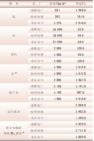 為對(duì)目前國內(nèi)幾個(gè)EA-FGD裝置的生產(chǎn)消耗及成本進(jìn)行比較,將液氨的價(jià)格按2 000元/t,水按2.00元/m 3,電按0.55元/(kW·h),蒸汽按60.00元/t副產(chǎn)品的售價(jià)按600元/t,裝置運(yùn)行成本的比較見圖5。