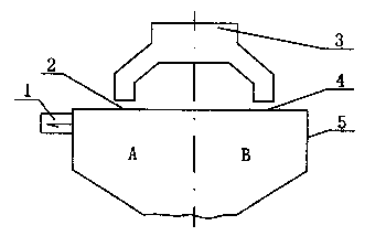 由于3、4爐槽上空間較小,布置空間沒有余地,故無法安置料倉頂吸式除塵。根據(jù)實際情況,選用壁側(cè)吸塵法,即在料倉側(cè)壁安裝吸塵口,從而使料倉處在負壓狀態(tài)下。投入運行后,發(fā)現(xiàn)該方案除塵效果不是很理想,主要問題是(見圖3):入料口A效果明顯,入料口B效果一般。在料倉貯料達到倉位的4/5 時,入料口B根本就無法達到除塵的目的,入料口A處的除塵也隨著料位的升高而逐漸減弱。其主要原因為:A半倉和B半倉開啟口較大,使料倉形成的負壓較小, 尤其在B半倉更是在倉A的影響下無法在卸料口形成局部負壓。根據(jù)以上情況,對其進行了優(yōu)化性改造:在工藝允許的前提下,把卸料車改為一通卸料,把料倉入料口A封閉,只留一塊看料位蓋板,同時將這一側(cè)卸料筒封閉,最終形成了只在入料口B卸料的局面,這種優(yōu)化性改造大大增強了B半倉的負壓,并且消除了料位對除塵效果的影響,實踐證明這種改造是成功的。再者,對卸料車的改造同1、2高爐一樣進行密封,使其也同步達到除塵的目的。