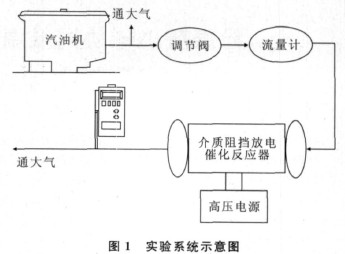 實驗系統(tǒng)見圖1 。實際汽油機尾氣由型號為HONDA EC2500L 的汽油發(fā)動機在正常定速運行條件下產(chǎn)生;介質(zhì)阻擋放電催化反應(yīng)器為同軸式放電管(自制設(shè)備) ,催化劑為自制改性粉煤灰小球,填充率為40 %;采用高壓脈沖電源供電,脈沖電壓峰值≤80 kV ,脈沖寬度≤500 ns ,脈沖前沿上升時間 ≤100 ns ,脈沖頻率≤100 kHz 。