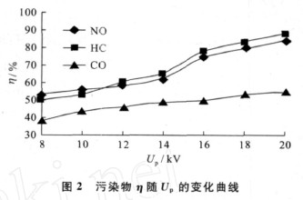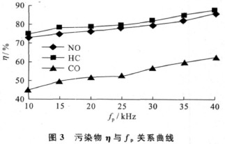 當(dāng)f p = 15 kHz 、G = 3 mm、qV = 0105 m3 / h 時, NO、HC 和CO 的η隨放電電壓的變化趨勢見圖2 。由圖2 知,NO、HC 和CO 的η均隨脈沖電壓的增加而增加。當(dāng)尾氣中污染物濃度一定時,電壓增加,電場強度亦增加,電子的平均動能變大,從而使裂解、電離等反應(yīng)頻率提高,活性粒子數(shù)目增加,最終使污染物η上升。此外,該反應(yīng)器去除NO 和HC 的效果明顯優(yōu)于CO ,這可能因反應(yīng)器中CO2 、顆粒物等在適當(dāng)?shù)臈l件下又生成了CO。