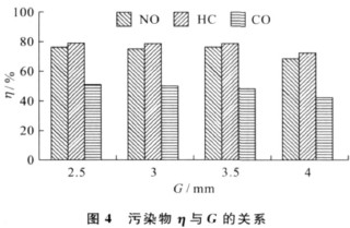 在相同輸入電壓下,反應(yīng)器的G 對反應(yīng)器的放電過程和放電功率有一定的影響, 但同時也會影響汽油機尾氣在反應(yīng)器內(nèi)的停留時間。故從理論上分析G對尾氣中污染物的η會有影響。