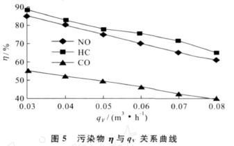 Up = 16 kV , f p = 15 kHz 、G= 3 mm 時污染物η 與qV 關(guān)系曲線見圖5 。圖5 表明,NO、HC 和CO 3 種污染物的η均隨qV 的增大而降低。主要因隨qV 增大,催化劑單位表面上污染物負荷增加;另外, qV 越大,尾氣在反應(yīng)器內(nèi)停留時間越短,去除NO、HC 和CO 的反應(yīng)發(fā)生得越少,污染物η也就越低。