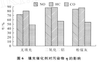 與不填充催化劑相比,填充γ2A12 O3 小球后, NO、HC 和CO 的η分別增加了1512 %、714 %和 718 %;而填充改性粉煤灰小球后,NO、HC 和CO 的η分別能達到8416 %、8717 %和5415 %,比不填充時分別增加1216 %、712 %和612 %。故在介質(zhì)阻擋放電反應(yīng)器中填充改性粉煤灰小球也能顯著提高汽油機尾氣中NO、HC 和CO 的η。