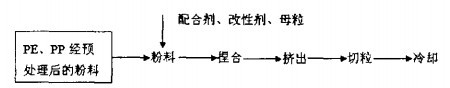 ③造粒:不論何種廢塑料制品,在制備回收廢塑料的再生粒料前,首先應(yīng)進行預(yù)處理:鑒別、分選、清洗、粉碎(硬制品)或切碎(軟制品),然后經(jīng)過兩段熱分干燥,使水分含量不超過5%。這樣處理過后的粉料經(jīng)與其他組分的配合與捏合后即可造粒。有的回收料(如回收PVC軟制品)也可不經(jīng)切碎而直接用開煉機塑化、放片、切料。各類品級的回收料的造粒工藝如下: