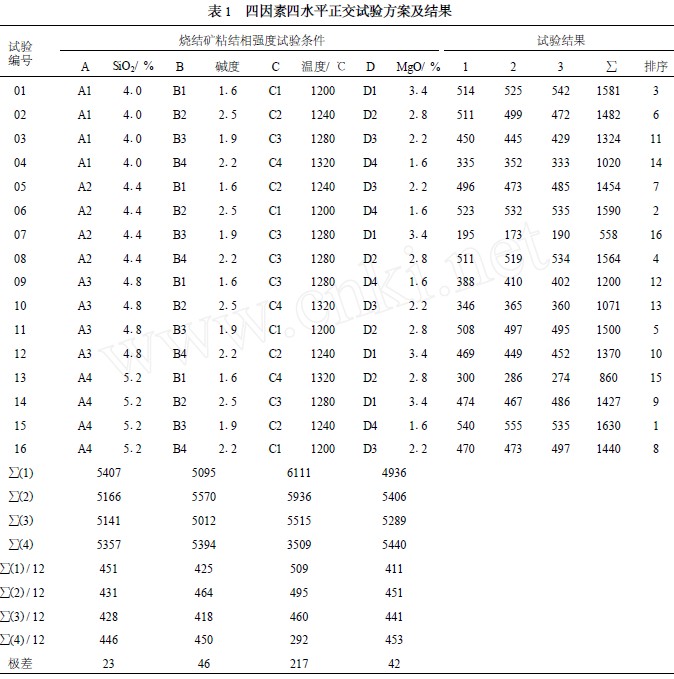 首先采用紅外微型燒結爐[1 ]就低硅燒結溫度、堿度、SiO2 含量、MgO 含量對燒結試樣粘結相強度(燒結基礎特性) 的影響進行了四因素四水平正交試驗,試驗方案及結果列于表1 。試驗所用礦粉為包鋼燒結常用原料,其中自產精礦與澳礦配比為85∶15 ,褐鐵礦粉為高硅礦,用量較少,主要用作SiO2 含量調節(jié),各種原料的化學成分列于表2 。試驗時,通過改變不同礦粉的配比來調整試樣的SiO2 含量,加入CaO、MgO 等化學純試劑調整試樣的堿度和MgO 含量。