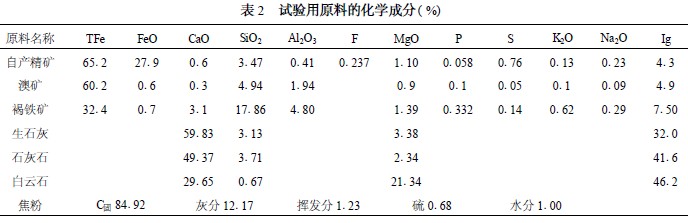 燒結杯試驗所用礦粉與微型燒結試驗相同,加入生石灰、石灰石和白云石來調整試樣的堿度與MgO 含量,試驗所用原料成分見表2 。按照各試驗點的成分要求,先將配好的干料混勻,再加水放入滾筒中造球,要求大于3 mm 的小球占到總數(shù)的70 %左右,然后測量混合料水分;將造好的混合料小球布入Á200 mm 的燒結杯中,上面放200 g 焦炭點火,點火負壓5 kPa , 燒結負壓10 kPa ,當燒結廢氣溫度降到200 ℃ 時燒結完成。取出燒結礦餅進行破碎、篩分,并檢測其篩分指數(shù)和轉鼓強度。