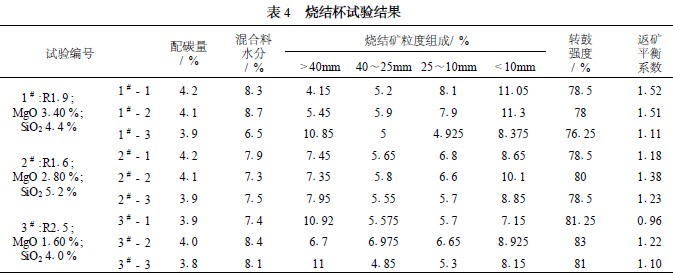 (2) 正交試驗所得粘結相強度最優(yōu)的3 # 試樣其燒結杯試驗的轉鼓強度也是最好的。1 # 、 2 # 、3 # 試樣的轉鼓強度排列順序為3 # > 2 # > 1 # ,與正交試驗粘結相強度的排列順序相一致, 驗證了正交試驗結果的正確性,再次說明粘結相強度這一燒結基礎特性能很好地反映實際燒結礦的轉鼓強度。對比各個試樣的返礦平衡系數(shù),3 # 試樣最低,即粉化率最低。