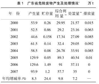 隨著廣東省產(chǎn)業(yè)結(jié)構(gòu)向高級化和適度重型化方向調(diào)整,全省工業(yè)危險廢物產(chǎn)生量增長趨勢明顯,2007年達(dá)93.9萬t[3],占全國8.7%,居第3 位,2000~2007年年均增長8.3%,低于同期國民生產(chǎn)總值(GDP)13.6%的年均增速,但無論增速還是產(chǎn)生總量均居全國前列。表1列出了 2000~2007年全省危險廢物的產(chǎn)生和處理情況。