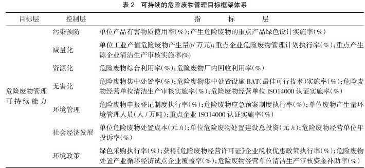 考慮到危險廢物管理涉及其從產(chǎn)生到處置的全過程,管理措施涉及技術(shù)、經(jīng)濟(jì)、政策等方面,將廢物管理目標(biāo)分為目標(biāo)層、控制層、指標(biāo)層3個不同層級,組成樹型結(jié)構(gòu)的指標(biāo)體系。目標(biāo)層是最高層,即危險廢物管理的可持續(xù)能力;控制層包括7類指標(biāo),其中,污染預(yù)防、減量化、資源化、無害化4類指標(biāo)涵蓋危險廢物從產(chǎn)生到處置的全過程;環(huán)境管理、社會經(jīng)濟(jì)發(fā)展、環(huán)境政策則涵蓋危險廢物管理的主要措施和手段。每類指標(biāo)又分別確定若干個具體目標(biāo),再根據(jù)不同的目標(biāo)設(shè)立終極指標(biāo)。可持續(xù)的危險廢物管理目標(biāo)體系框架建議如表2所示。