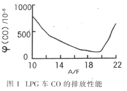 C0 是烴類燃料燃燒的中間產(chǎn)物, 理論上, 當(dāng)空燃比A/F=14.7 時(shí)燃料完全燃燒, 其產(chǎn)物為C02 和H2O; 當(dāng)空氣量不足, A/F<14.7 時(shí), 則有部分燃料不能完全燃燒, 其產(chǎn)物為CO 和H2O, 還有大量未燃燒的HC; 當(dāng)空氣量充足,A/F>14.7 時(shí), 不生成CO, 排氣中則含有大量未參加反應(yīng)的O2。由此可見(jiàn), CO 是當(dāng)空燃比A/F<14.7 時(shí)部分燃料沒(méi)有完全燃燒的產(chǎn)物。圖1 是LPG 車(chē)排氣中的一氧化碳與空燃比的關(guān)系。